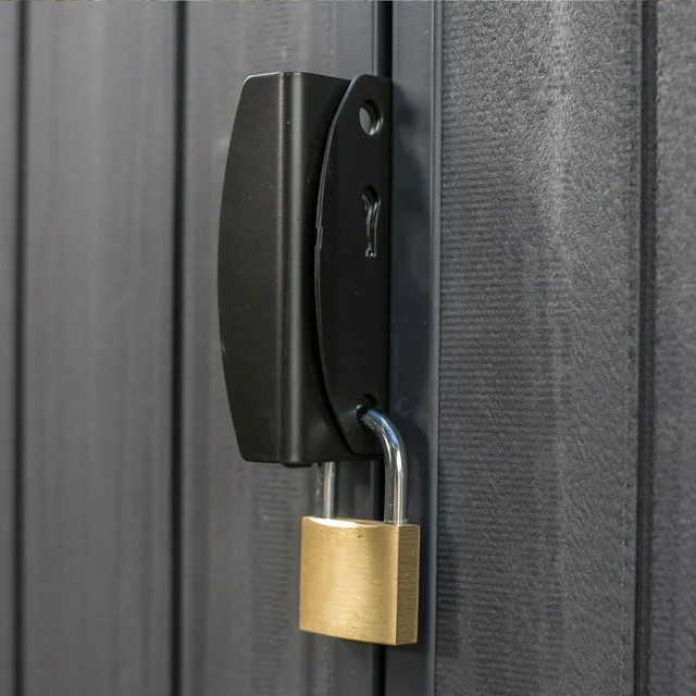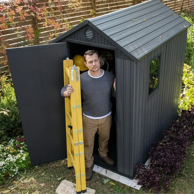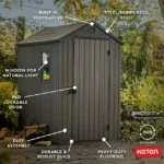• Outdoor 4 x 6-foot storage shed made with weather-resistant plastic prohibits rust and decay