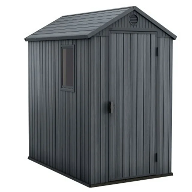 Declutter your garage and improve your outdoor storage with the Keter Darwin 4 x 6 Foot Outdoor Storage Shed for Garden Accessories and Tools.Designed with polypropylene resin plastic, this shed is weather resistant and won’t rust, rot, or decay as months go by. The included side window allows plenty of natural light to enter the shed, making all the contents easily visible. The spacious and well-lit interior also features a ventilation grille that keeps fresh air in, and mildew and dampness out, protecting all of your garden accessories.The tongue and groove construction of this shed makes assembly easy and does not require any special tools. Along with it’s easy assembly, storage shelves are included, which you can utilize to declutter your space even more. Fit anything on these shelves such as paint, jars, or bags of potting soil. Ready for any inclement weather, this durable shed comes equipped with heavy-duty floor panels for a sturdy foundation and long-lasting storage year-round.For ample space and durable storage, invest in the Keter Darwin 4 x 6 Foot Outdoor Storage Shed for Garden Accessories and Tools.