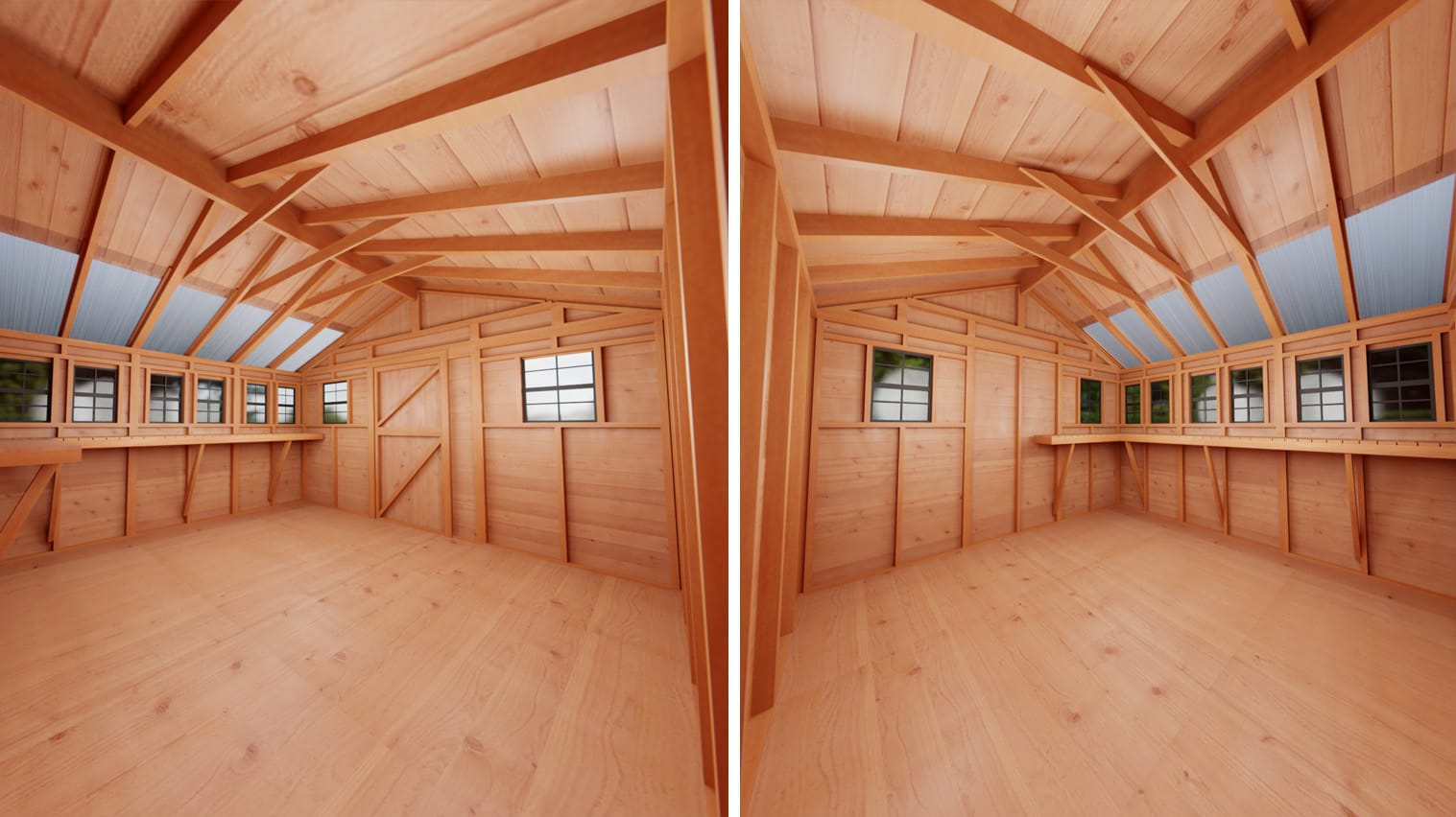 - Flexible Layout and Workbench Included: Designed with versatility in mind, the Sunshed’s panelized construction allows for multiple layout configurations, letting you position doors, windows, and roof panels to best fit your space. A 16 in. deep L-shaped full-wall workbench is included, offering a convenient surface for projects or storage.